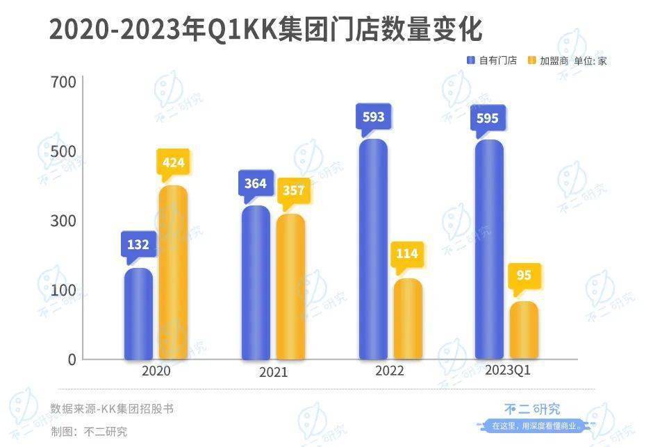 2020-2022年,KK旗下加盟商从424家快速减少至114家,同期自有门店增加至593家;但2023年一季度,KK自有门店增加2家,加盟店却关闭了19家。