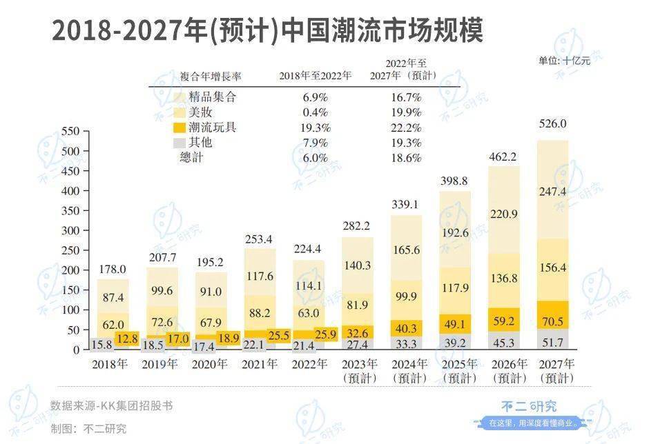 潮流零售拥有千亿级别的广阔市场。根据弗若斯特沙利文,2022年潮流零售市场规模为2244亿元,预计2027年市场规模将达到5260亿元,复合年增长率达18.6%;而同期中国整体零售市场规模年复合增速为6.0%。