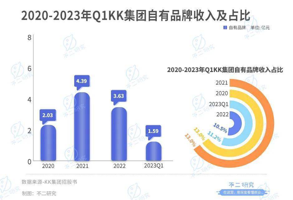 另外,自有品牌占比较少始终是KK经营中的一根刺。2020-2022年以及2023年一季度,KK自有品牌贡献营收占比分别为13.0%、13.0%、10.5%及11.2%。
