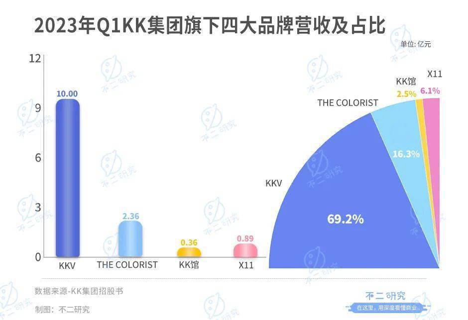 招股书数据显示,2023年一季度KKV、THE COLORIST、KK馆、X11分别贡献了10.00亿元、2.36亿元、0.36亿元、0.89亿元营收,占总营收比重为69.2%、16.3%、2.5%和6.1%。