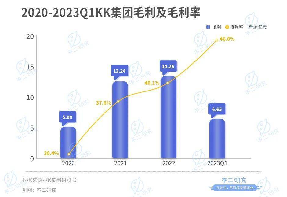 从毛利来看也是如此。2020-2022年及2023年一季度,KK的毛利分别为5.00亿元、13.24亿元、14.26亿元及6.65亿元,其中2020-2021年呈现翻倍式上涨,同比增长164.8%,但2022年增速断崖式下跌,仅有7.70%。