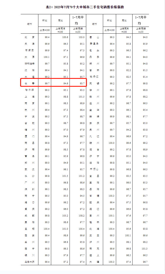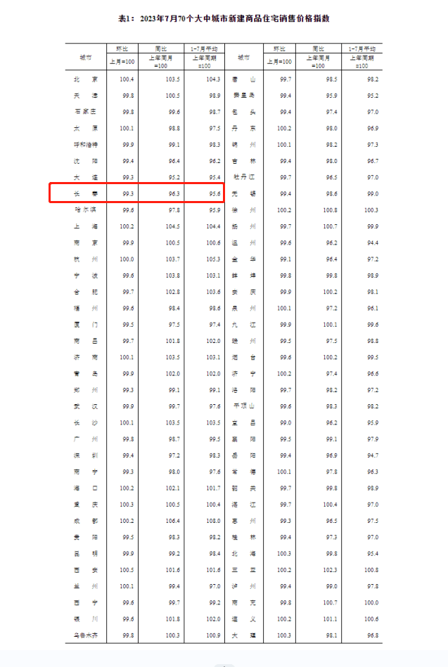 8月16日,国家统计局发布了“2023年7月份70个大中城市商品住宅销售价格变动情况”。长春7月新建商品住宅销售价格指数环比下跌0.7%,同比下跌3.7%;二手房销售价格指数环比下跌0.3%,同比下跌5.4%。