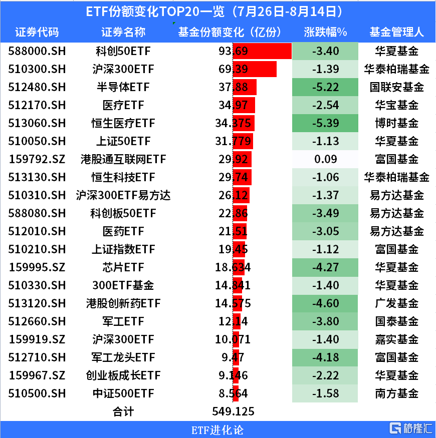 从7月26日-8月14日,跟踪沪深300指数的ETF产品份额合计飙增107亿份。其余的宽基指数如科创50、上证50也颇受资金青睐,尤其是前者,资金越跌越买,连续7周爆买。