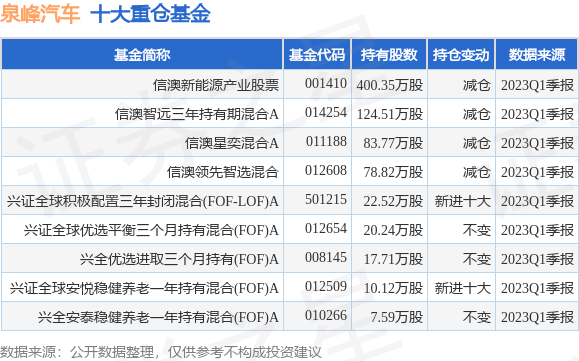 根据2023Q1季报公募基金重仓股数据,重仓该股的公募基金共9家,其中持有数量最多的公募基金为信澳新能源产业股票。信澳新能源产业股票目前规模为107.16亿元,最新净值3.524(6月7日),较上一交易日下跌0.28%,近一年下跌19.32%。该公募基金现任基金经理为冯明远。冯明远在任的基金产品包括:信澳科技创新一年定开混合A,管理时间为2020年5月29日至今,期间收益率为12.54%;信澳研究优选混合A,管理时间为2020年6月22日至今,期间收益率为6.92%;信澳星奕混合A,管理时间为2021年1月22日至今,期间收益率为0.36%。