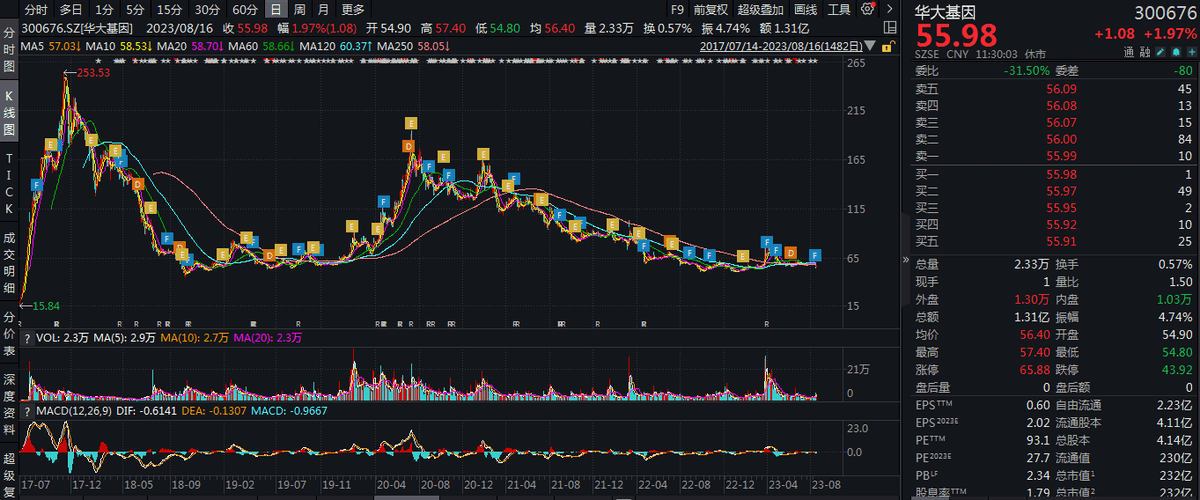 截止2023年8月16日午盘,华大基因报收于55.98元/股,已较2020年的高点下挫 71.21%,市值为232亿元。
