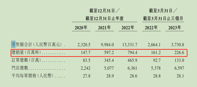 2022 年,茶百道共卖出7.94亿杯奶茶,门店零售额达到约133亿元,2020年至2022年的复合年增长率为139.7%。