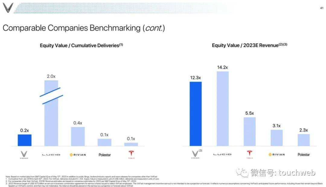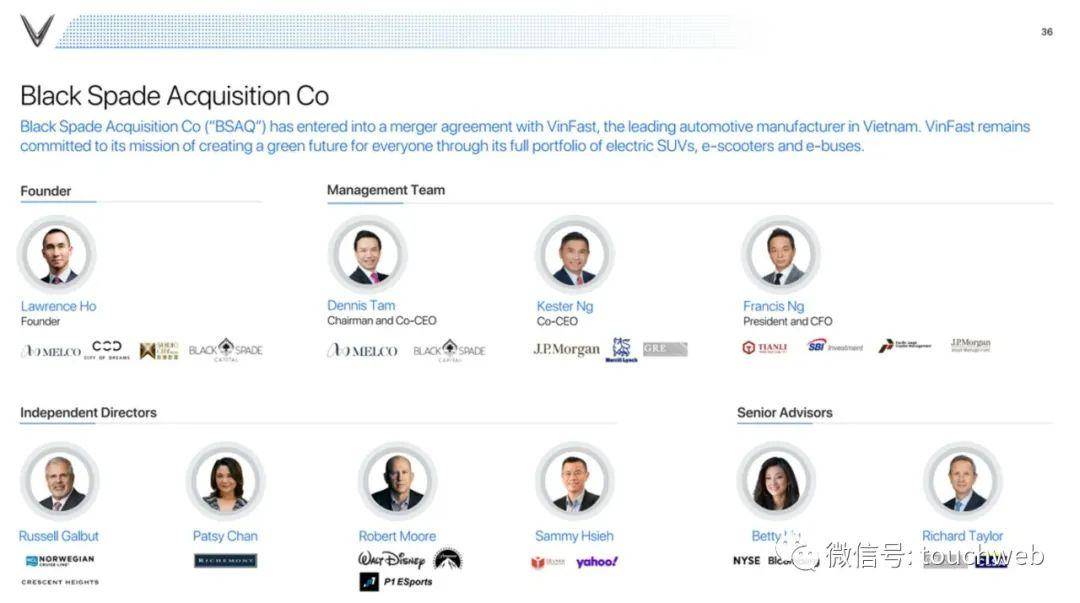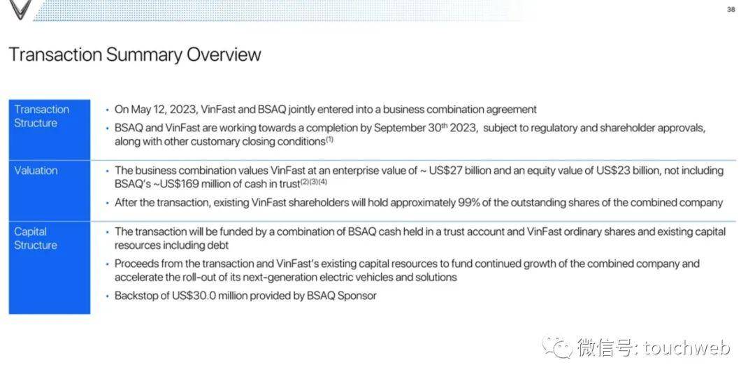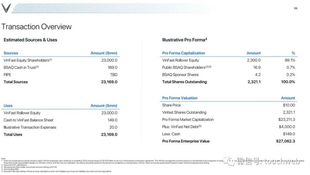企业合并对VinFast的估值约为270亿美元,股权价值约为230亿美元,不包括来自BSAQ的约1.69亿美元信托现金(假设没有Black Spade股东选择赎回其Black Spade股份 在允许的情况下使用现金)。