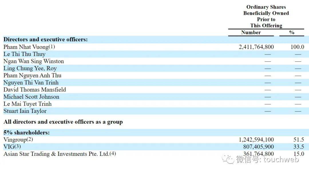IPO前,Pham Nhat Vuong持有Vinfast公司100%股权,主要是通过三个公司持股,其中,Vingroup持股为51.5%,VIG持股为33.5%,Asian Star Trading & Investments持股为15%。