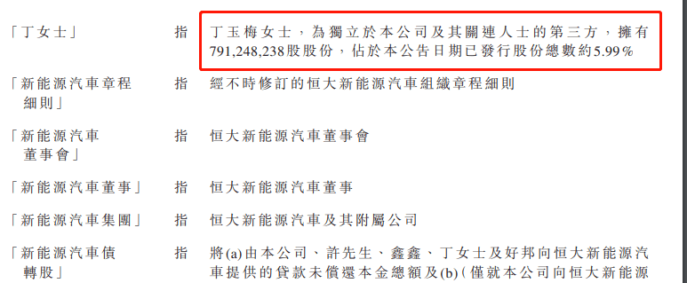 恒大在公告称,丁玉梅为独立于公司及其关连人士的第三方,持有7.91亿或5.99%恒大股份,故丁玉梅并非主要股东。