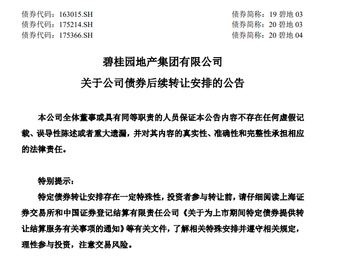 红星资本局8月16日消息,今日,碧桂园地产集团有限公司发布公告称,根据相关规定,“19碧地03”“20碧地03”“20碧地04”将自2023年8月18日起按照《通知》有关规定转让并继续停牌。当前公司债券兑付存在重大不确定性,为保障债券持有人权益,公司将严格按照相关债券《募集说明书》及《债券持有人会议规则》等文件约定落实偿债保障措施。