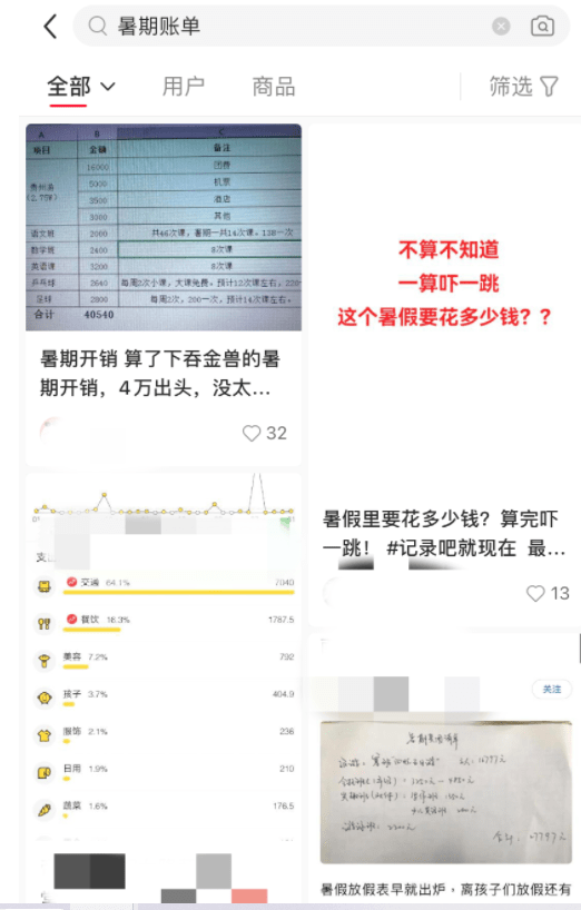 小红书等平台上显示,有家长晒出国内旅游5天约1万元的账单,而选择出国游则需要3-5万元。主要开销包括旅游和报名兴趣班、研学游,有的家长称短期研学游费用约为5-6千元,专业课程约1万元。