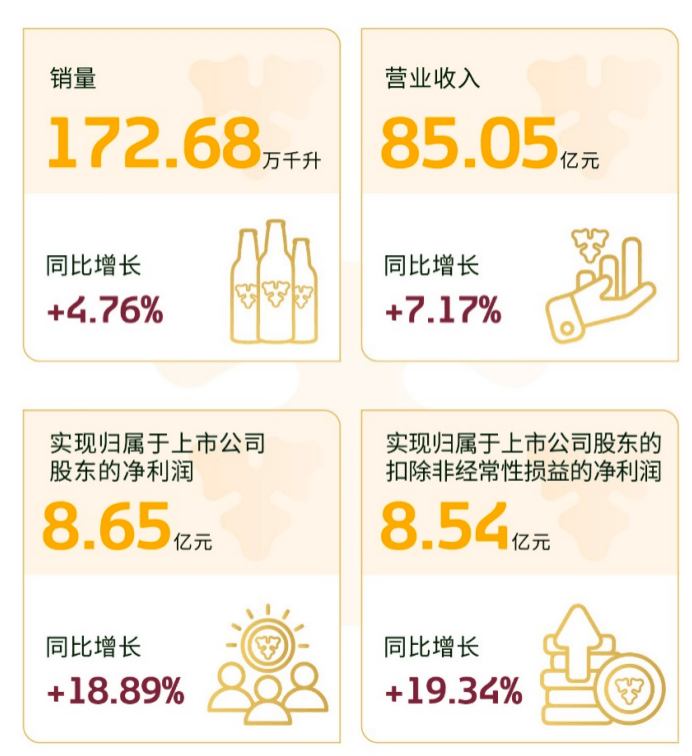 8月16日,重庆啤酒发布的2023年半年报显示,2023年上半年,重庆啤酒实现啤酒销量172.68万千升,比上年同期增长4.76%;实现营业收入85.05亿元,比上年同期增长7.17%;实现归属于上市公司股东的净利润8.65亿元,比上年同期增长18.89%;实现归属于上市公司股东的扣除非经常性损益的净利润8.54亿元,比上年同期增长19.34%。