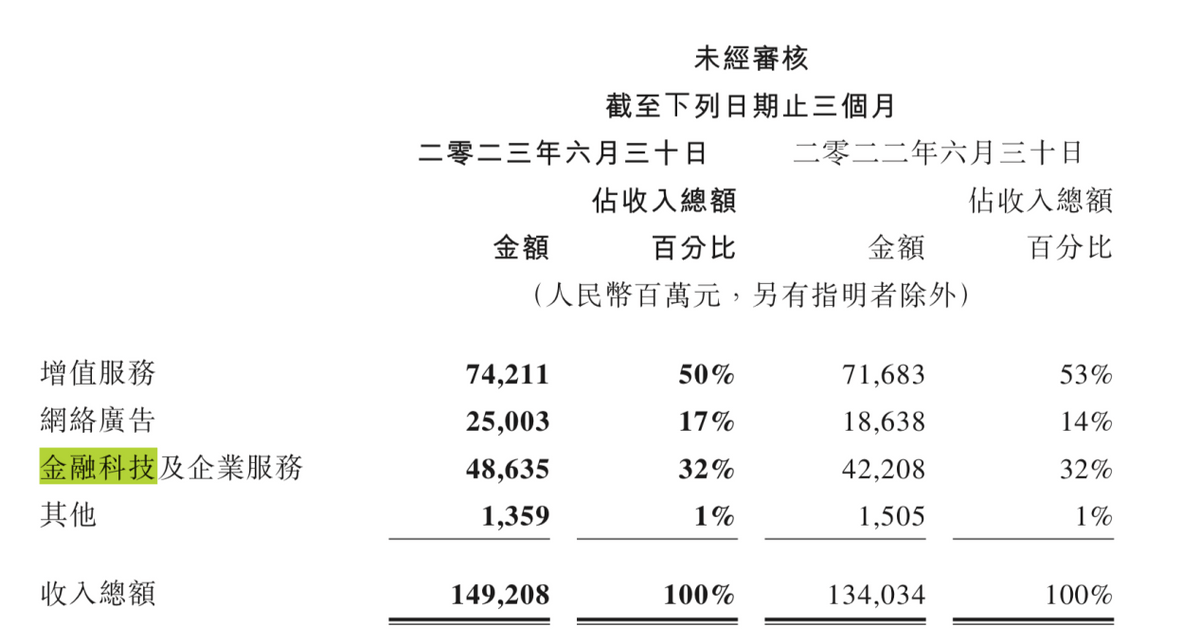 在金融科技板块,二季度,腾讯金融科技及企业服务业务收入同比增长15%至人民币486亿元,占比总营收32%。