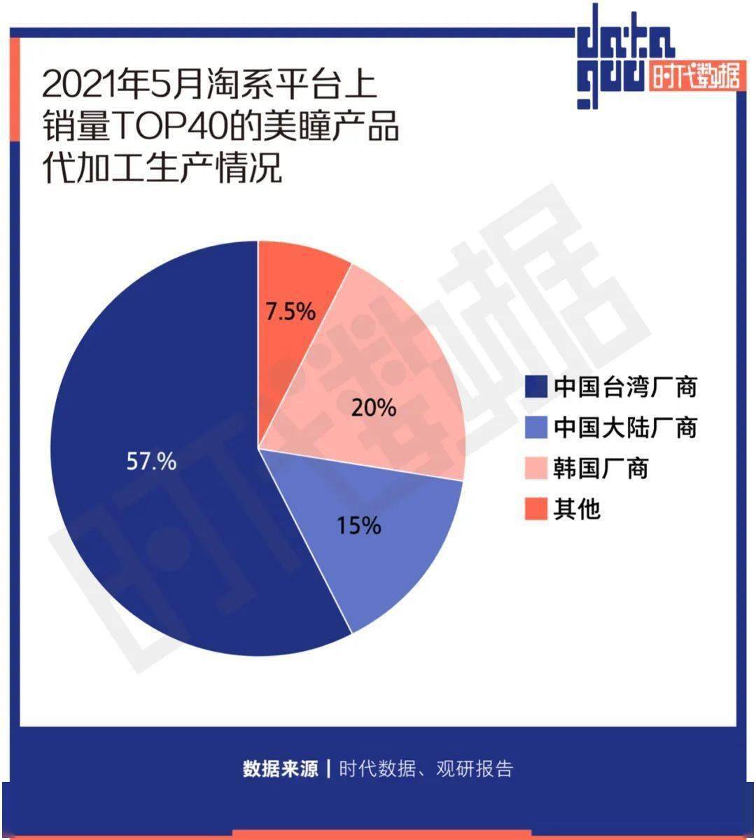 据公开资料显示,市面上约90%的美瞳产品为代工生产形式,其中,中国台湾生产供应比例较大。数据显示,2021年5月,淘系平台上销量TOP40的美瞳产品中,中国台湾生产的占比近6成,中国大陆厂家生产占比达15%。