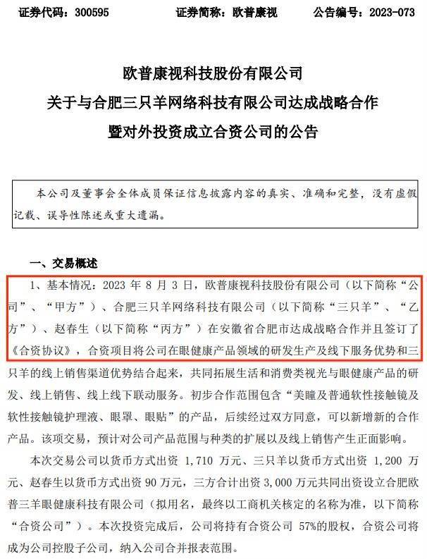 前段时间,疯狂小杨哥被爆出与上市公司“欧普康视”达成合作。小杨哥背后的三只羊与欧普康视共同成立合资公司,孵化美瞳品牌“梦视清”由欧普康视提供“美瞳”等新业务线产品,小杨哥则负责线上卖货。