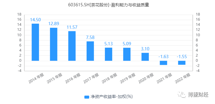 从一些指标可以清晰看到这种痛苦。净资产收益率,也就是ROE,可以成为一个公司盈利能力与收益质量的评判维度。拉长时间,茶花股份的ROE从2014年的14.50%逐年下降,直至到达2021年-1.63%的低点。