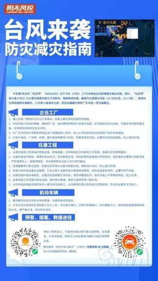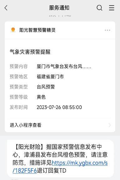 为加强防范,阳光还根据台风和暴雨特点,设计制作《台风防灾减灾指南》,定向为客户推送;并通过公众号、微信及朋友圈向广大人民群众普及灾害应急措施,提供出险后便捷的报案通道,为客户提供有温度的阳光服务。
