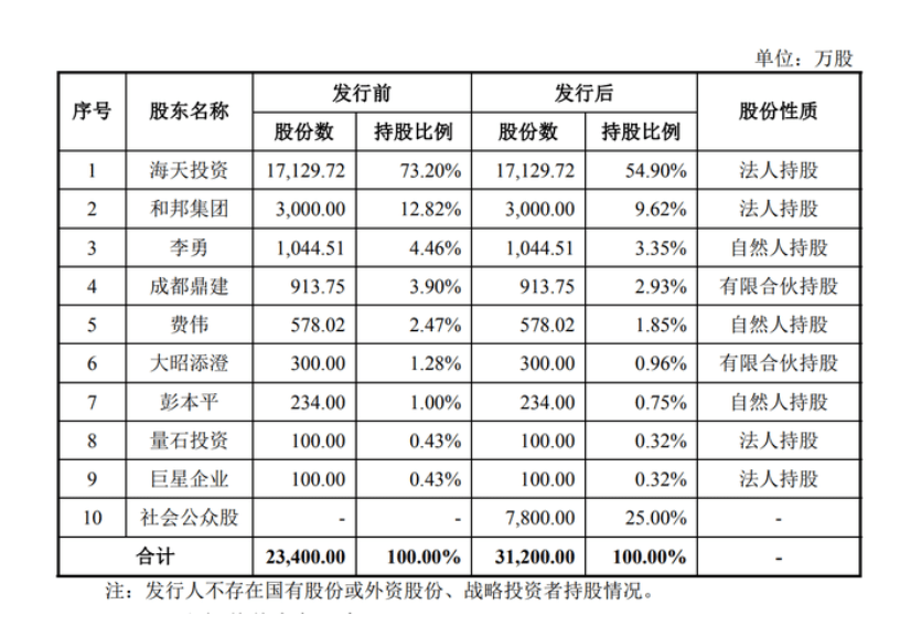 根据海天股份招股书,公司IPO前的股东名单上,和邦集团持股为12.82%,成都鼎建持股为3.9%,彭本平持股为1%,量石投资持股为0.43%,巨星企业持股为0.43%。