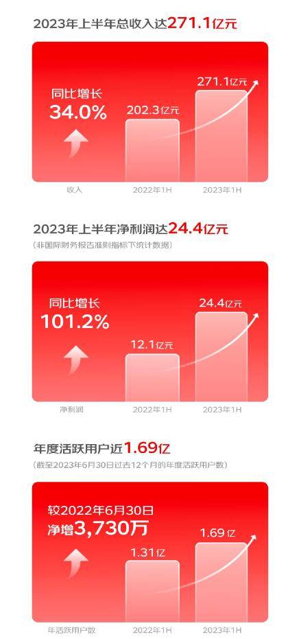 京东健康2023年中期业绩报告显示,京东健康今年上半年总收入为人民币271亿元,同比增长34%,非国际财务报告准则指标下(Non-IFRS)净利润24.4亿元,同比增长101.2%。