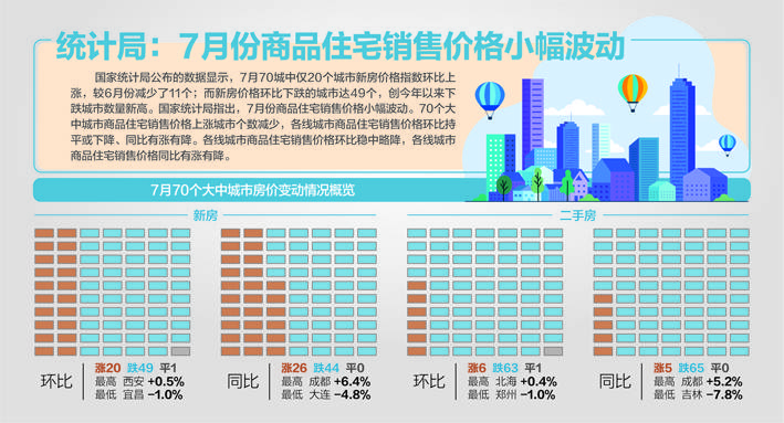 国家统计局城市司首席统计师绳国庆当日解读数据时表示,7月份70城商品住宅销售价格上涨城市个数减少,各线城市商品住宅销售价格环比持平或下降、同比有涨有降。