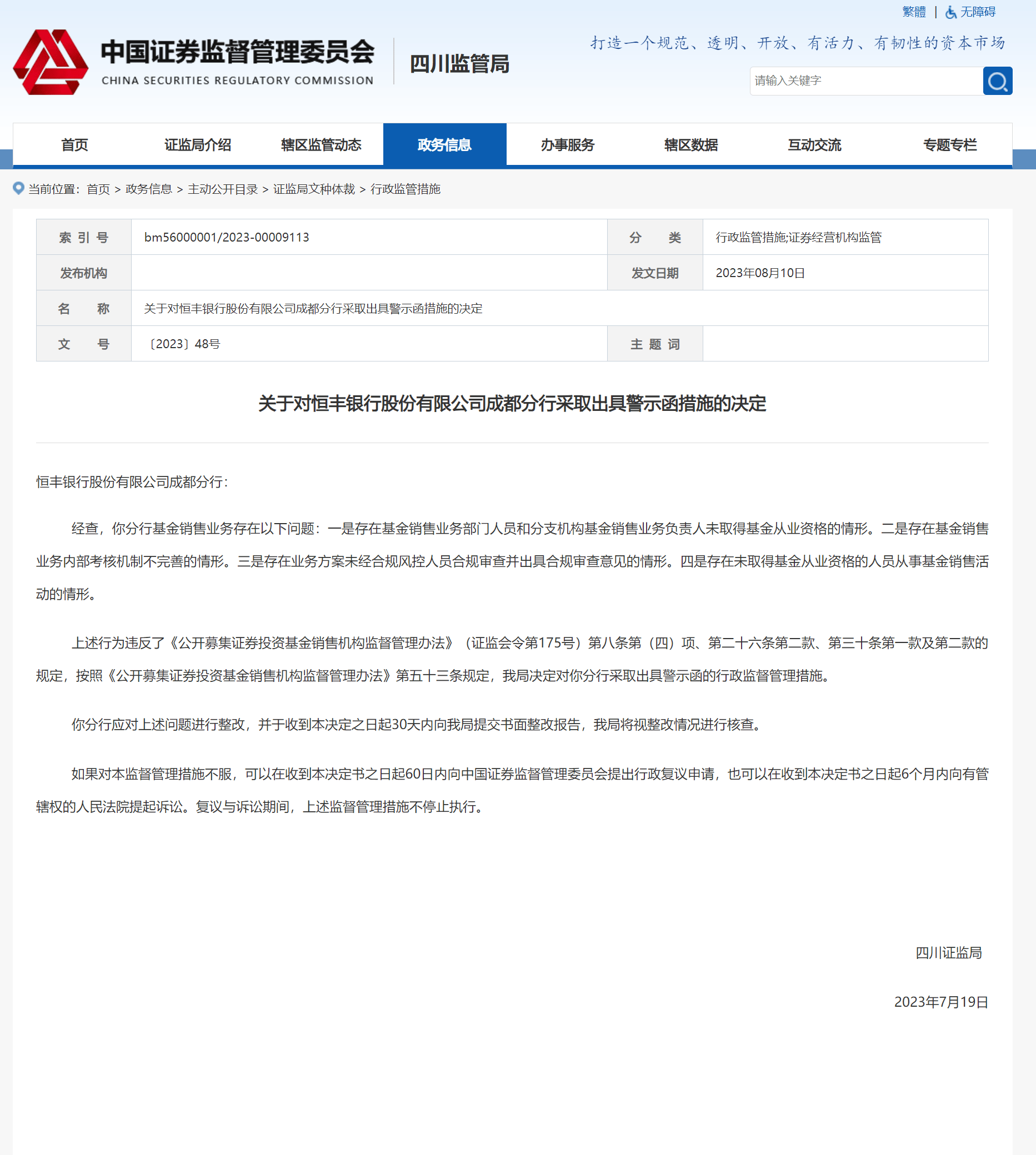 近日,四川证监局披露了对恒丰银行成都分行的罚单,其因基金销售业务存在违规问题被采取行政监管措施。