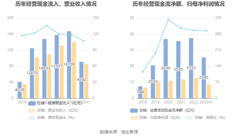 2023年上半年,公司营业收入现金比为106.79%,净现比为294.27%。