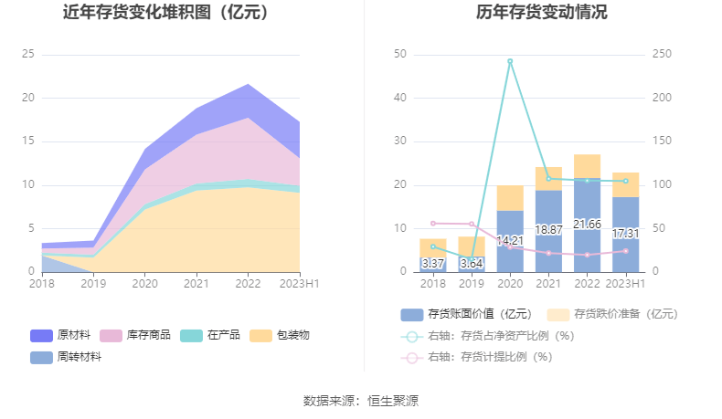从存货变动来看,截至2023年上半年末,公司存货账面价值为17.31亿元,占净资产的104.84%,较上年末减少4.35亿元。其中,存货跌价准备为5.62亿元,计提比例为24.51%。