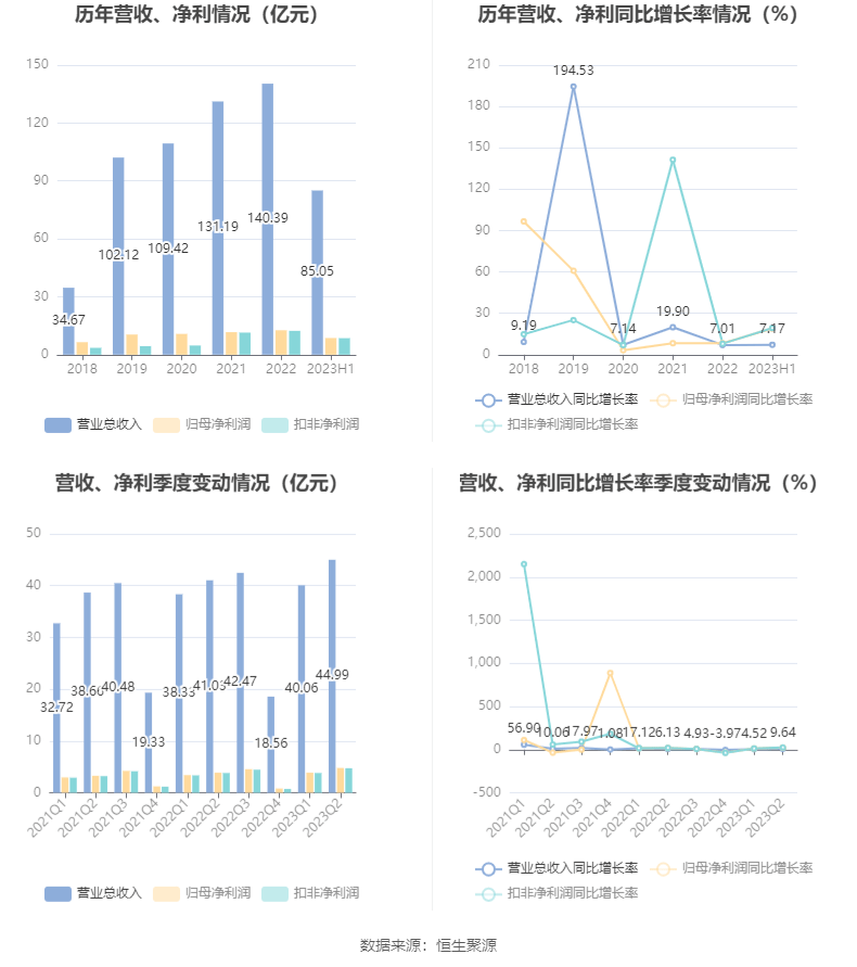 根据半年报,公司第二季度实现营业总收入44.99亿元,同比增长9.64%,环比增长12.31%;归母净利润4.78亿元,同比增长23.52%,环比增长23.51%;扣非净利润4.73亿元,同比增长24.11%,环比增长23.93%。