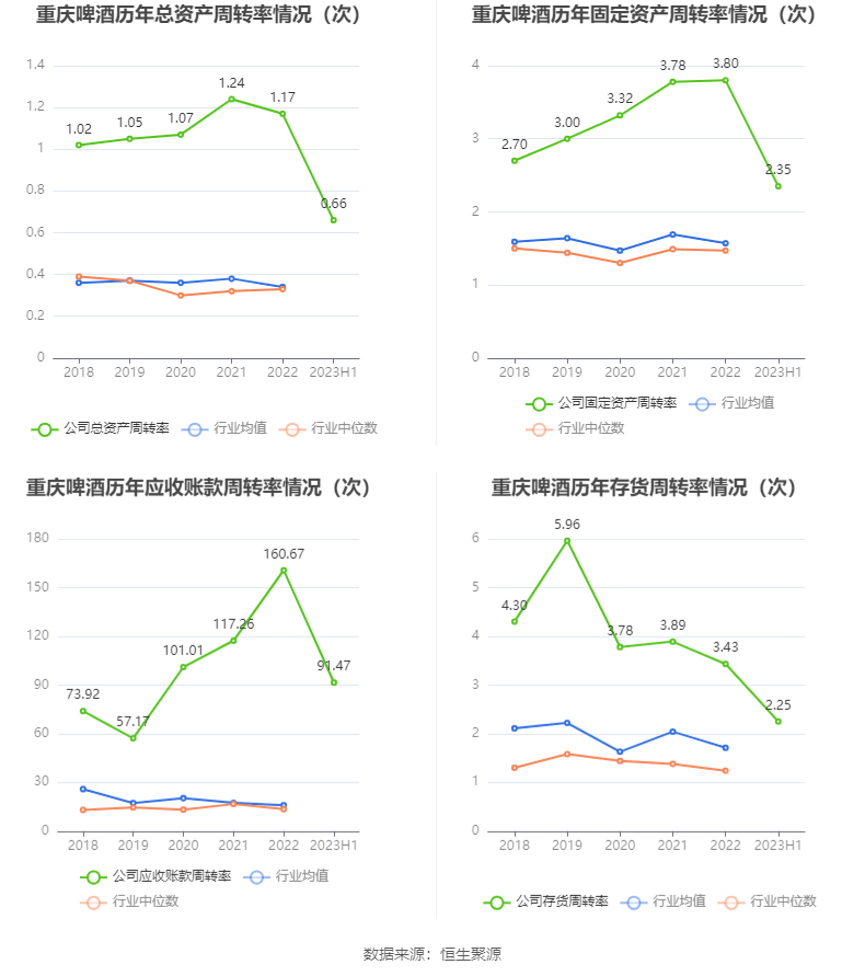 营运能力方面,2023年上半年,公司总资产周转率为0.66次,上年同期为0.66次(2022年上半年行业平均值为0.16次,公司位居同行业1/16);固定资产周转率为2.35次,上年同期为2.18次(2022年上半年行业平均值为0.76次,公司位居同行业1/16);公司应收账款周转率、存货周转率分别为91.47次、2.25次。
