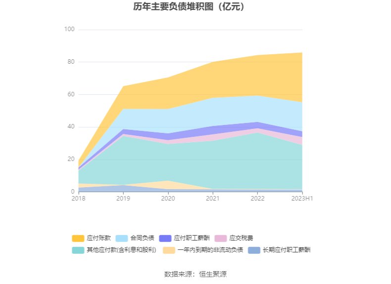 负债重大变化方面,截至2023年二季度末,公司应付账款较上年末增加22.60%,占公司总资产比重上升3.40个百分点;合同负债较上年末增加10.80%,占公司总资产比重上升0.75个百分点;其他流动负债较上年末减少12.61%,占公司总资产比重下降0.03个百分点;一年内到期的非流动负债较上年末增加2.84%,占公司总资产比重不变。