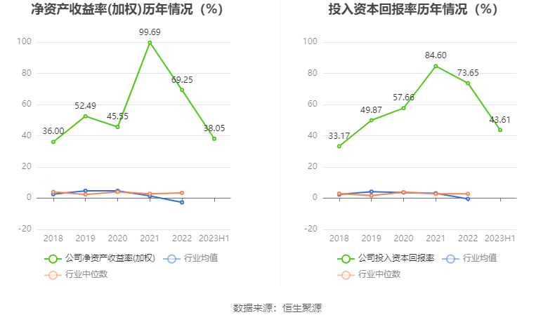 数据显示,2023年上半年公司加权平均净资产收益率为38.05%,较上年同期增长0.90个百分点;公司2023年上半年投入资本回报率为43.61%,较上年同期增长1.08个百分点。