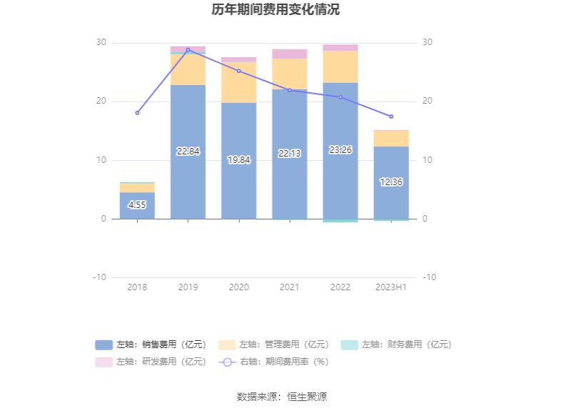 2023年上半年,公司期间费用为14.86亿元,较上年同期增加2883.14万元;但期间费用率为17.47%,较上年同期下降0.89个百分点。其中,销售费用同比增长6.96%,管理费用同比增长2.19%,研发费用同比下降81.19%,财务费用由去年同期的-1943.04万元变为-2978.44万元。