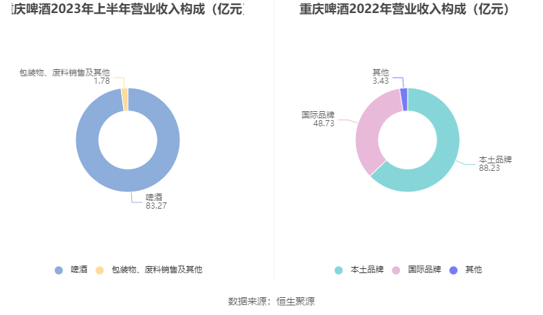 分产品来看,2023年上半年公司主营业务中,啤酒收入83.27亿元,同比增长7.17%,占营业收入的97.91%;包装物、废料销售及其他收入1.78亿元,同比增长7%,占营业收入的2.09%。