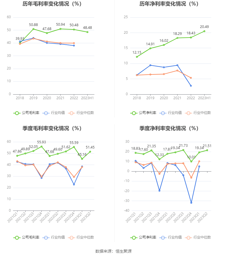 2023年上半年,公司毛利率为48.48%,同比下降0.19个百分点;净利率为20.49%,较上年同期上升1.86个百分点。从单季度指标来看,2023年第二季度公司毛利率为51.45%,同比上升1.85个百分点,环比上升6.29个百分点;净利率为21.51%,较上年同期上升2.17个百分点,较上一季度上升2.17个百分点。