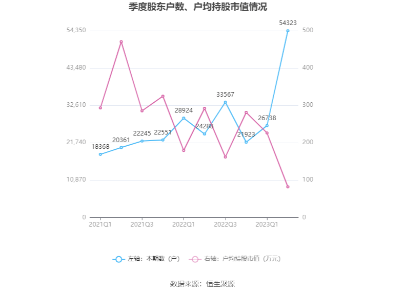 筹码集中度方面,截至2023年二季度末,公司股东总户数为5.43万户,较一季度末增长了2.76万户,增幅103.17%;户均持股市值由一季度末的226.26万元下降至82.11万元,降幅为63.71%。