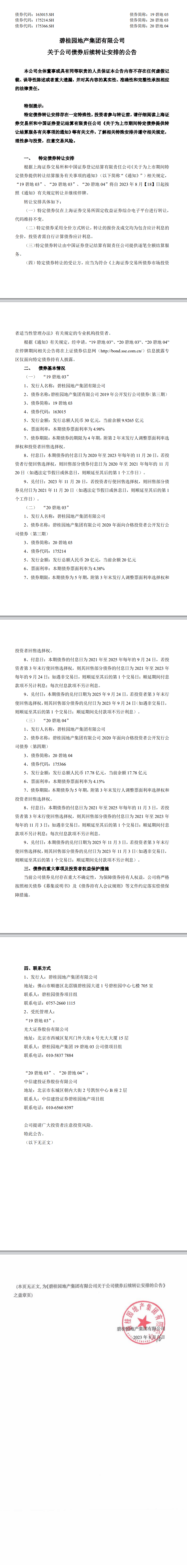 上海证券交易所网站消息,碧桂园地产集团有限公司8月16日发布公告称,根据上海证券交易所和中国证券登记结算有限责任公司《关于为上市期间特定债券提供转让结算服务有关事项的通知》(以下简称“《通知》”)相关规定,“19碧地03”、“20碧地03”、“20 碧地04”将自2023年8月18日起按照《通知》有关规定转让并继续停牌。