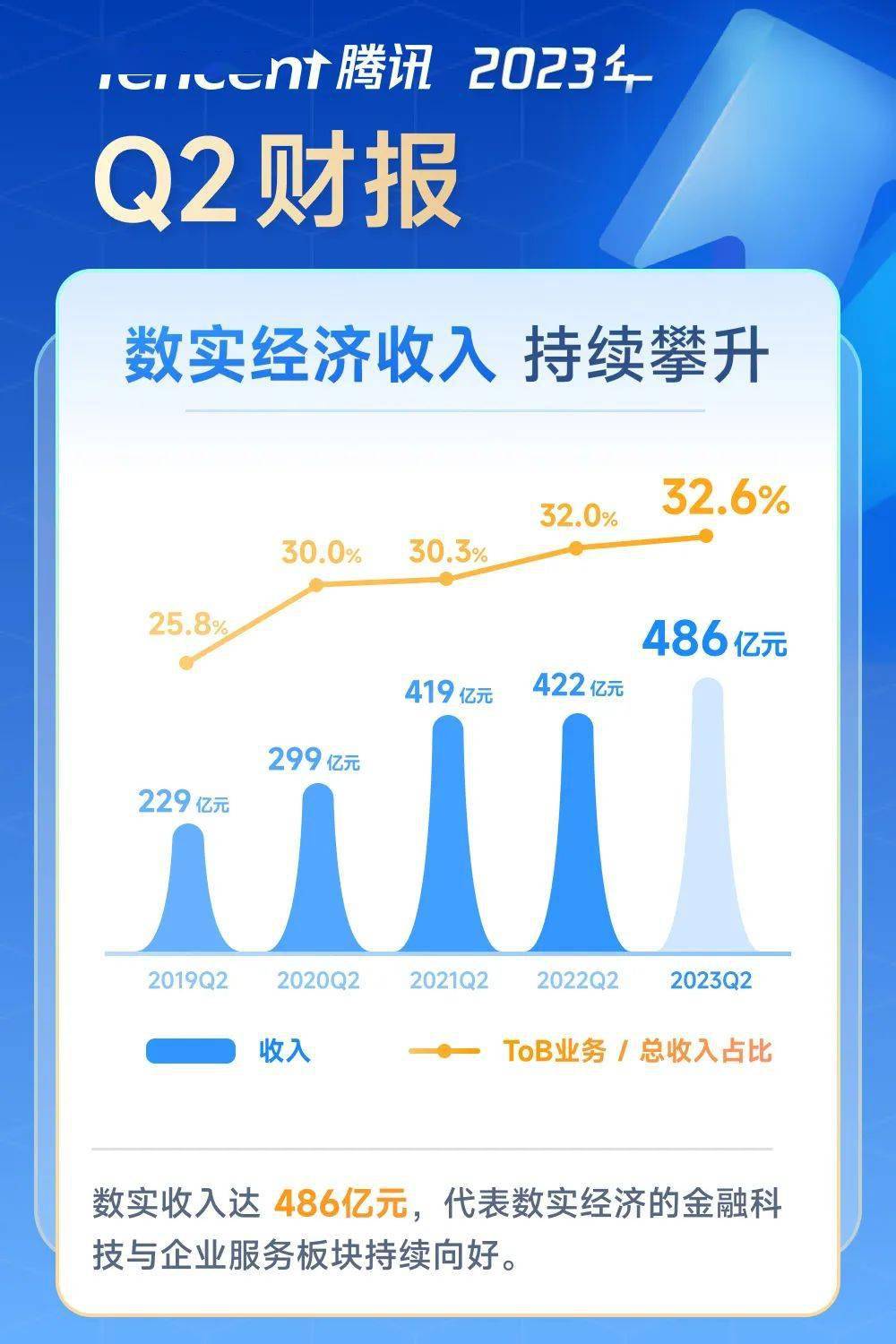 马化腾曾表示,腾讯将不断加大自主创新力度,深度参与“数实融合”。而从财报表现来看,作为“数实融合”的业务代表,腾讯“金融科技及企业服务”业务收入第二季度达到486亿元,同比增长15%,占总营收的比重达到约32%,成为本季度业绩收入贡献最大板块。