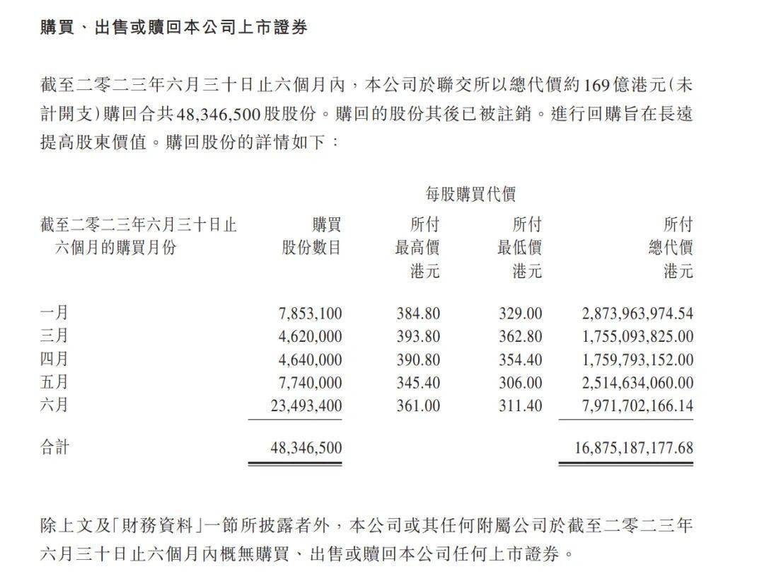 财报显示,为长远提高股东价值,截至2023年6月30日止六个月内,腾讯已回购约169亿港元(未计开支)股份,合计共约4834.65万股股份,购回的股份已被注销。