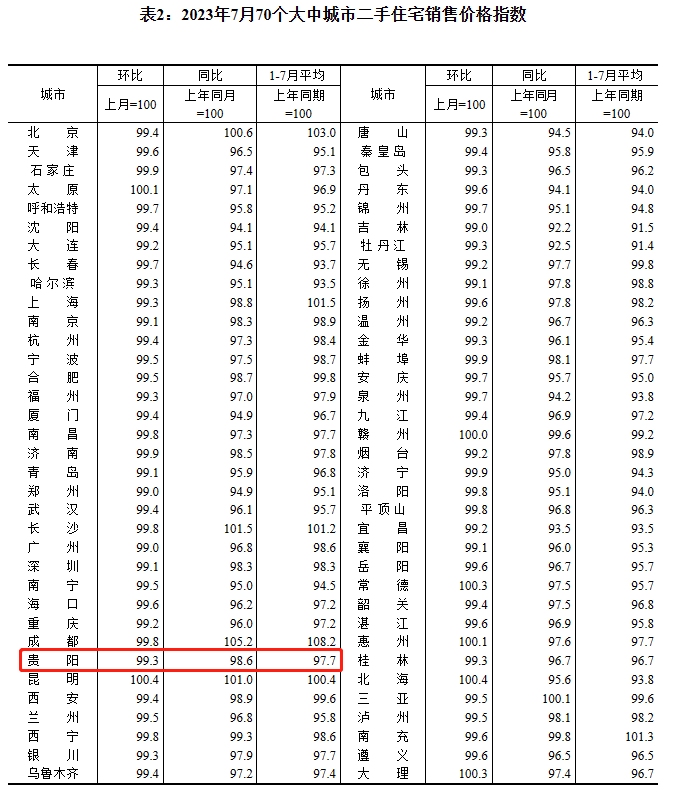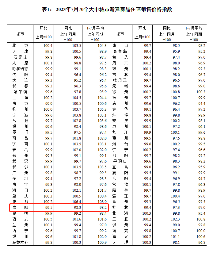 乐居新媒体 贵阳8月16日,国家统计局发布2023年7月份70个大中城市商品住宅销售价格变动情况。2023年7月份,70个大中城市商品住宅销售价格上涨城市个数减少,各线城市商品住宅销售价格环比持平或下降、同比有涨有降。