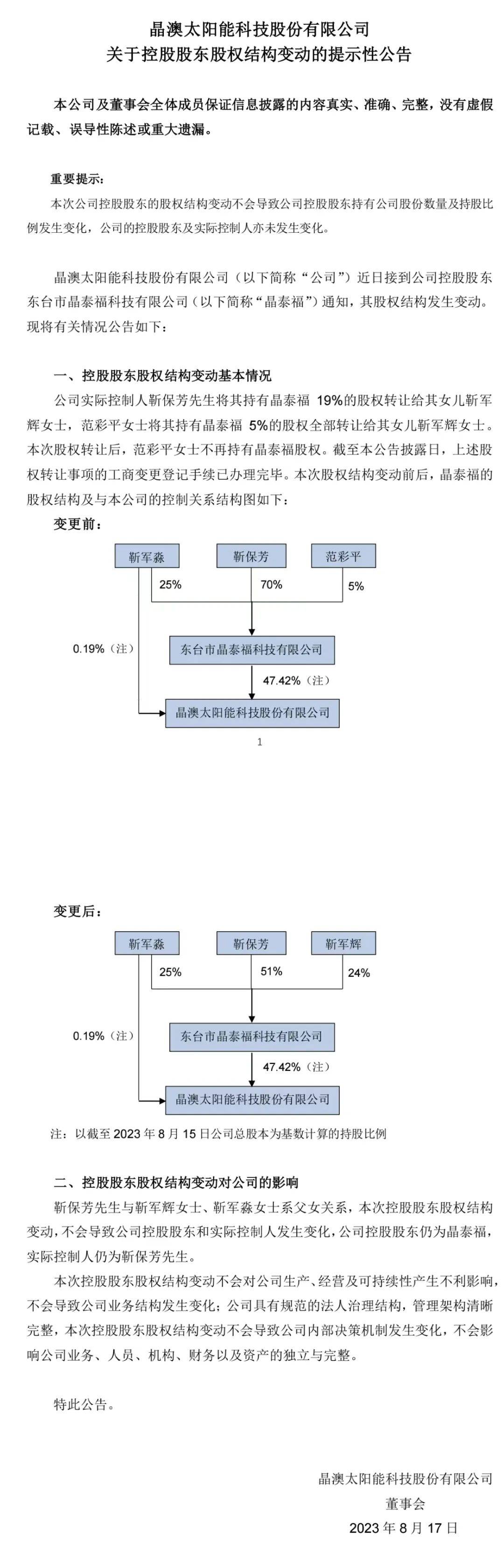 晶澳科技8月16日晚公告,公司实际控制人靳保芳将其持有的晶泰福19%股权转让给其女儿靳军辉,范彩平将其持有晶泰福5%的股权全部转让给其女儿靳军辉。