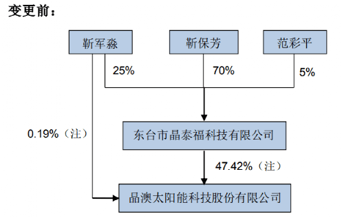 2021年6月,晶澳科技公告,靳保芳将其持有的晶泰福25%股权转让给其二女儿靳军淼。变更后,靳保芳在晶泰福的股份变为70%,靳军淼持股25%,靳保芳之妻范彩平则持股5%。