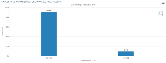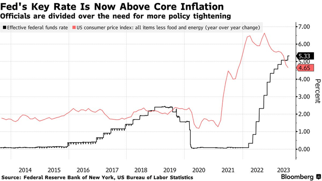 尽管最近的报告显示,劳动力市场强劲但正在降温,通胀率较一年前大幅下降,考虑到年通胀率仍远高于2%的目标,美联储官员在7月的会议上选择了加息25个基点,将联邦基金利率推至在5.25%至5.5%的区间,为22年来最高。