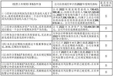 公司股票交易被实施退市风险警示后,首个会计年度为2022年度。根据大华会计师事务所(特殊普通合伙)于2023年4月27日对公司2022年度财务报告出具的标准无保留意见的《审计报告》(大华审字[2023]001809号)以及对照《股票上市规则(2023年修订)》第9.3.11条规定逐项自查,公司2022年度经营情况未触及《股票上市规则(2023年修订)》第9.3.11条规定的任一情形。