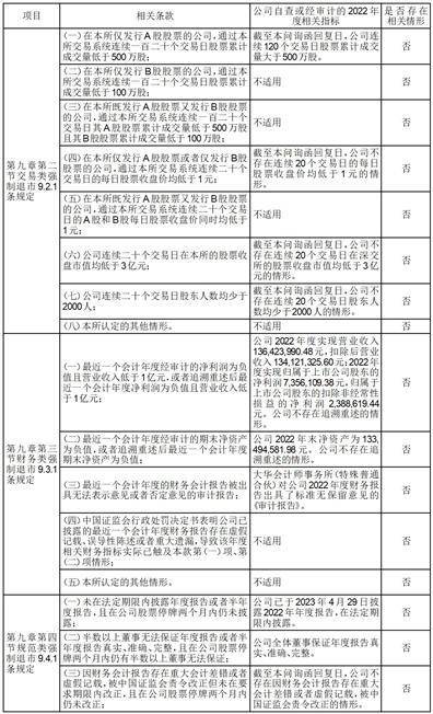 根据上表逐项自查情况,公司不存在《股票上市规则(2023年修订)》第九章规定的股票终止上市情形以及股票交易应实施退市风险警示或其他风险警示的情形。