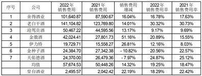 公司2022年度销售费用率为18.29%,同行业可比公司销售费用率均值为19.25%,基本持平。2021年度略高于同行业平均值。公司营业收入同比增长49.77%,销售费用同比增加22.19%,营业收入同比增长高于销售费用同比增长,上表中,舍得酒业、老白干酒和迎驾贡酒的营业收入同比增长均高于销售费用同比增长,由于公司营业收入基数相对较小,增幅略高于同行业水平。综上,报告期内销售费用增幅与营业收入增幅是相匹配的。