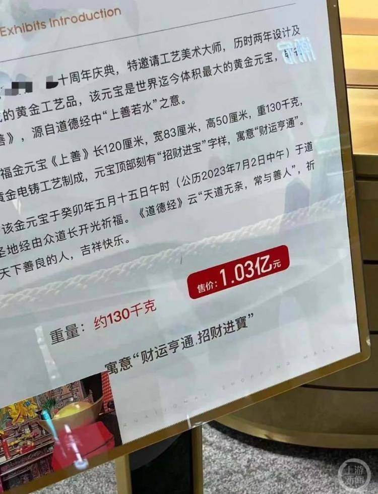 ▲购物中心展示售价1.03亿的金元宝。图片来源/网络截图
