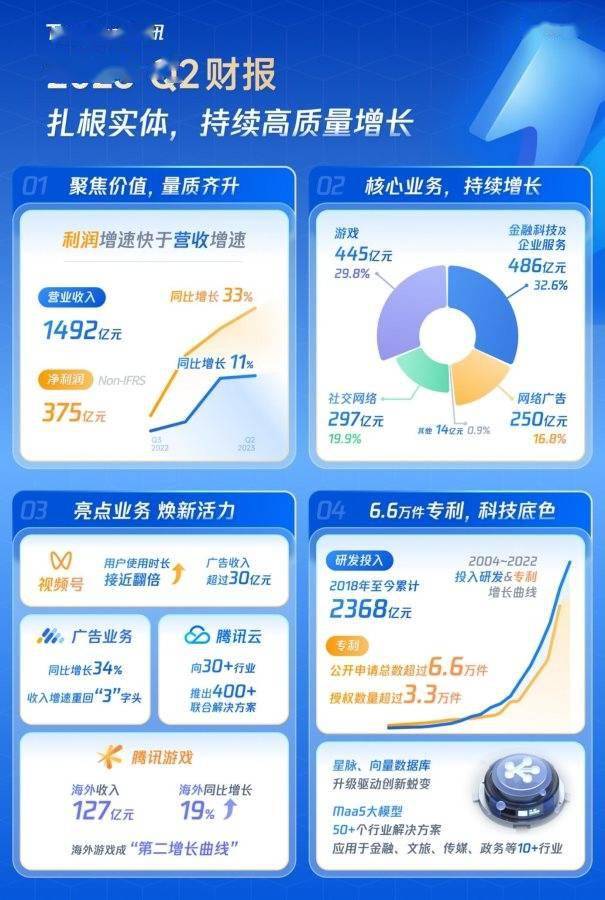 受益于外部环境的回暖和市场需求的复苏,二季度腾讯广告、数实经济等核心主业实现稳健增长。