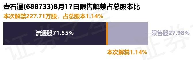 根据市场公开信息整理,壹石通(688733)于8月17日将有227.71万股限售股份解禁上市,为公司首发战略配售股份,占公司总股本1.14%。最近一年内,该股累计解禁1.01亿股,占总股本的50.69%。本次解禁后,公司还有5589.16万股限售股份,占总股本27.98%。具体如下图所示: