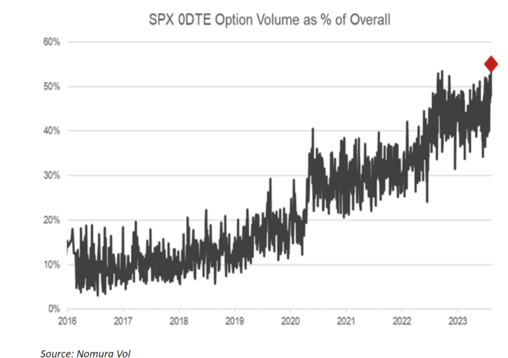 野村估算,上周四,约有186万份和标普500挂钩的0DTE期权换手,占标普总成交量的55%,占比创最高纪录。8月才过半,月内就有四天的0DTE期权交易量跻身十大最高交易日之列。