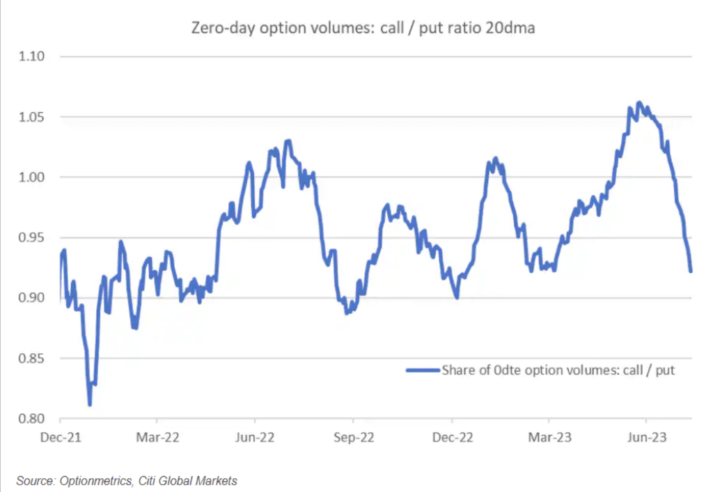 花旗的美股交易策略主管Stuart Kaiser则是注意到,交易员青睐的0DTE期权从看涨转变为看跌。其数据显示,过去20天内,看跌期权的交易量比看涨期权多了将近10%,而之前两个月,都是投资资金主要都流入看涨期权。